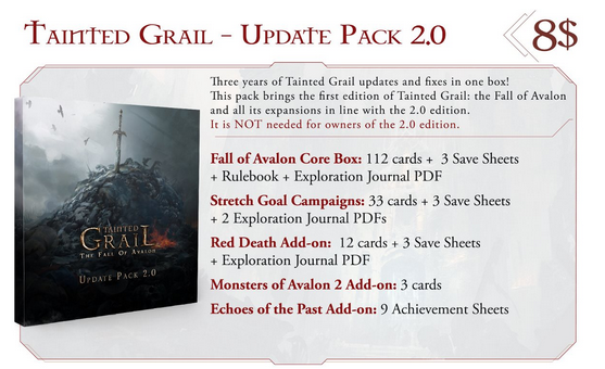 私たちが古典的なTainted Grailのキャンペーンと拡張の2.0版を発表して以来、最も多かった要望は、初版の所有者が更新された復刻版を購入した人と同じゲームをプレイできるようにするための更新パックを求めることでした。このようなパックを作るには多くの困難と難しい決断が伴いましたが、私たちはそのコストと影響の間で最良の妥協点を見出したと信じています。