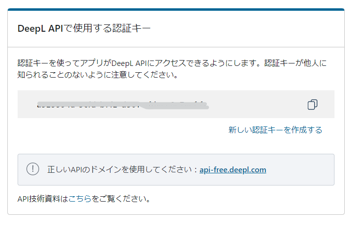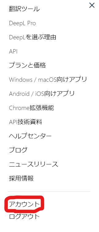 プログラムでDeepLのAPIを使うためには、「アカウント」で「DeepL APIで使用する認証キー」を取得してください。