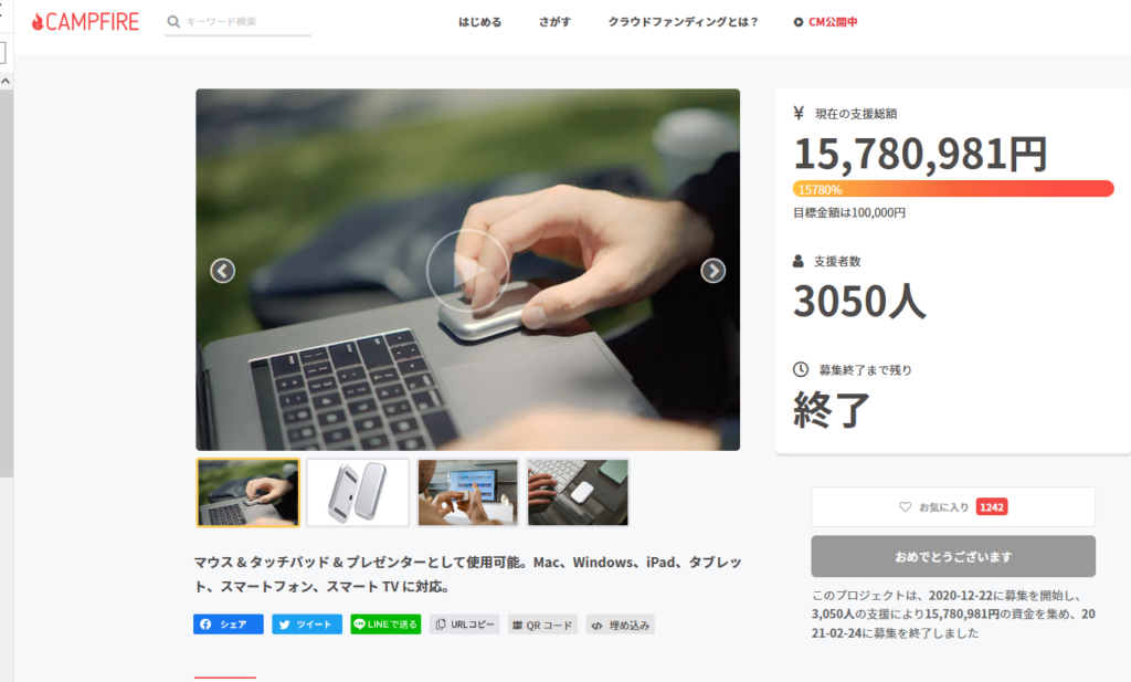 キックスターターで、エアーマウス、レーザーポインタ、タッチパッドにもなるマウスを支援しました。