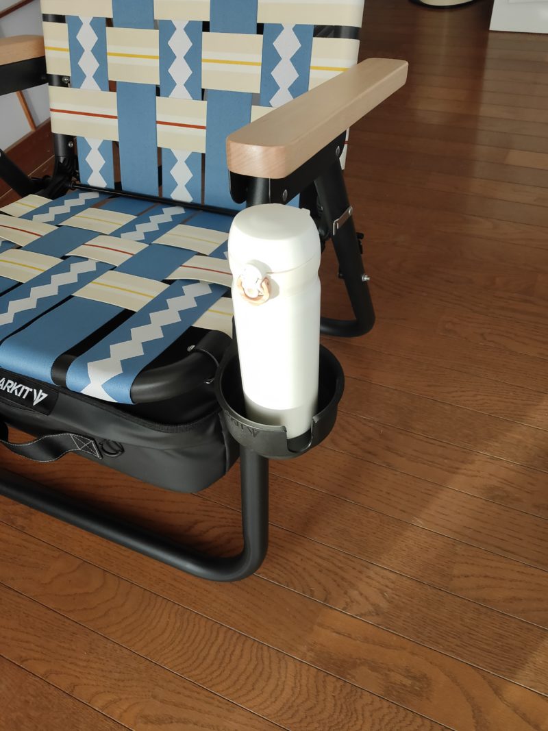 飲み物を置くホルダーもついています。写真の水筒は缶ビールとかと同じ太さです。もう一回り太い飲み物でも入ります。入れるところは太さの違う2段深さになっているので以下の水筒でも安定しています。